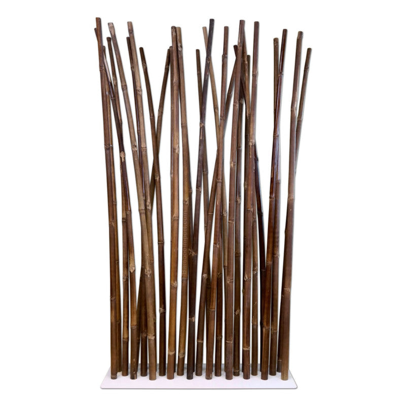 This stunning design is created with 29 untreated Java black bamboo sticks, each around 200cm long and 35mm in diameter and secured upon a white powder coated steel base plate.